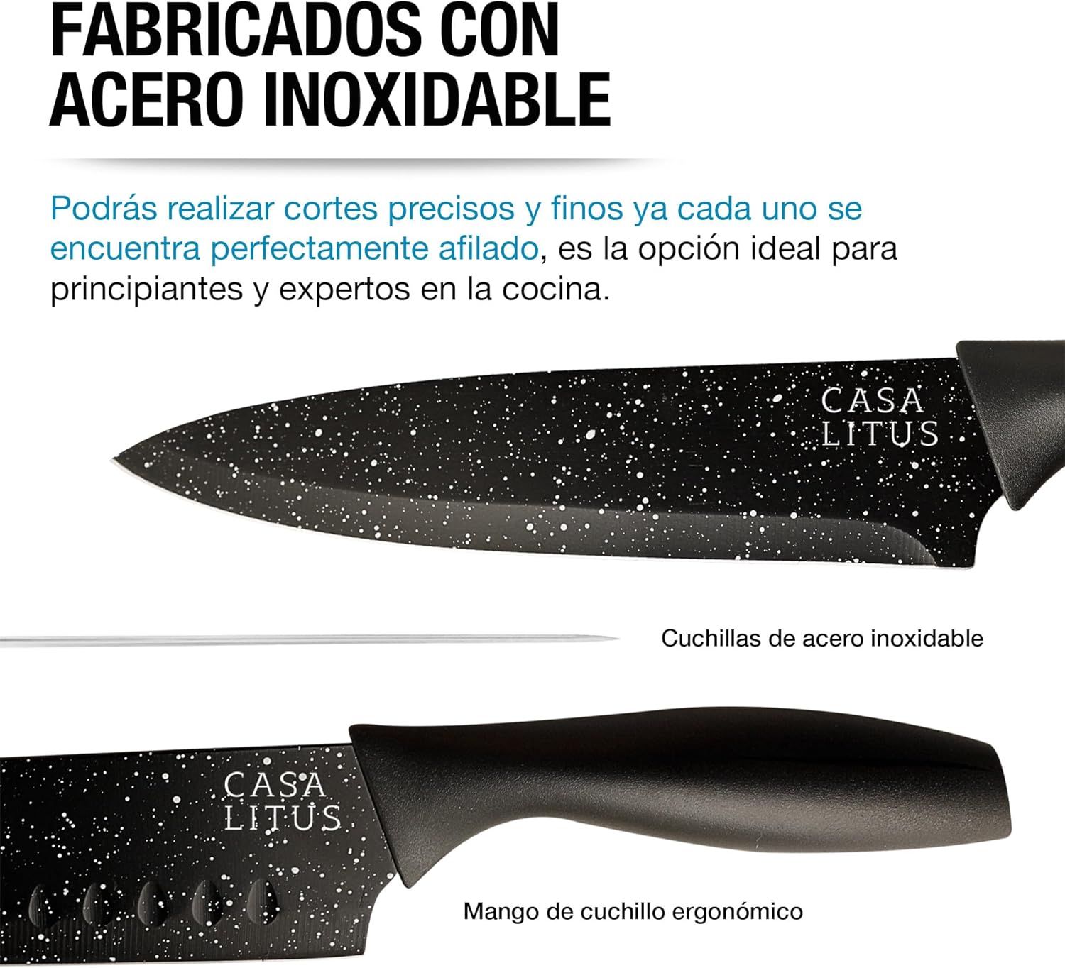 Fabricados con acero inoxidable de alto grado, estos cuchillos están construidos para resistir el paso del tiempo, el uso constante y el lavado frecuente sin perder su filo ni su brillo. Son una inversión inteligente que mantendrá su valor y rendimiento por muchos años en su cocina. 💎